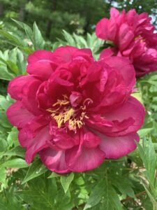 Big double blooms have vibrant, deep magenta-red petals. Flowers are held closer to the foliage, creating a compact, rounded form that requires no staking. Mildew-resistant foliage stays attractive all season long.